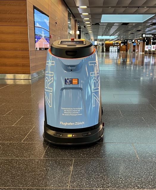 i’m sitting at an airport, the gate area is very quiet, it’s early morning. a door opens and out pops a cleaning robot.